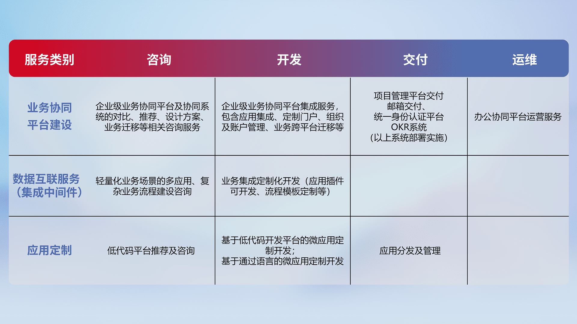 针对钉钉、、、、企微、、IDaas等平台级产品提供产品的规划、、、方案、、、交付、、、定制化开发等服务,,实现如统一协同办公、、智能客户服务、、、、混合会议管理、、、、智能数据查询、、等业务场景,,,,实现数字化转型。。