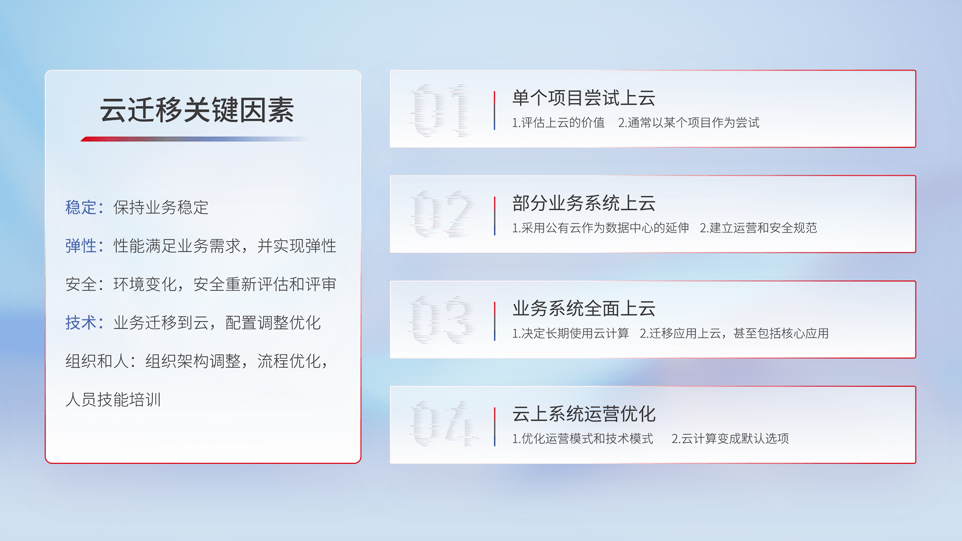 结合实际业务,,,,从规划设计、、、云平台选型、、、云原生改造、、、、数据迁移、、、集成交付,,迁移全过程为客户识别最佳上云路径,,,,做好风险识别管理,,设计网络架构、、身份权限、、、、安全审计合规、、操作审计、、、、日志审计、、监控告警策略、、、、多站点容灾设计等,,对云上基础设施进行整体规划,,提升IT治理水平,,,以满足弹性、、、高可用、、、高性能的需求。。。。