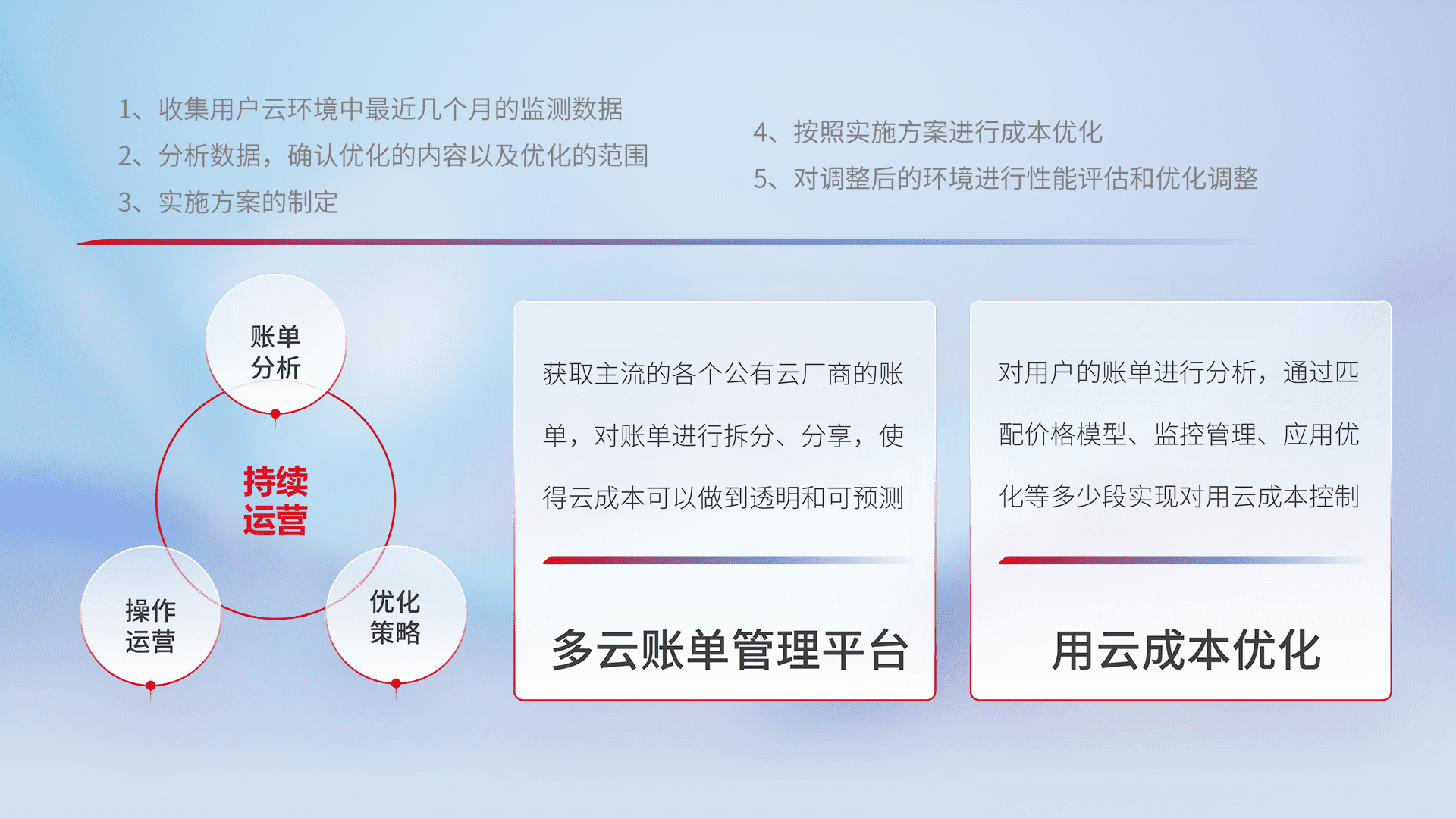 通过多云纳管,,以统一的资源数据模型把客户的云资源进行抽象和封装,,进而实现对多云资源的统一操作,,,保障云资源管理的可靠性、、、稳定性与可用性。。。。量身定制化运维内容,,,,配置、、、开发运维、、、补丁管理、、、备份、、、监控、、认证和访问管理、、、审计和日常巡检等,,,保障在用云过程中的可靠度,,稳定度以及高可用率。。。。